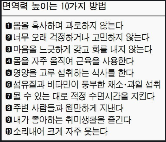 사람은 면역력이 강해야 건강하게 오래 살 수 있습니다. 입안이 자주 헐고 감기에 잘 걸리는 분들은 면역력이 약하다는 증거이기도 하지요. 스스로 나의 몸의 면역력을 떨어뜨리는 요인들을 알아 미리 조심하면 질병을 멀리하며 의미있는 삶을 살아 가는데 도움이 될 것입니다.