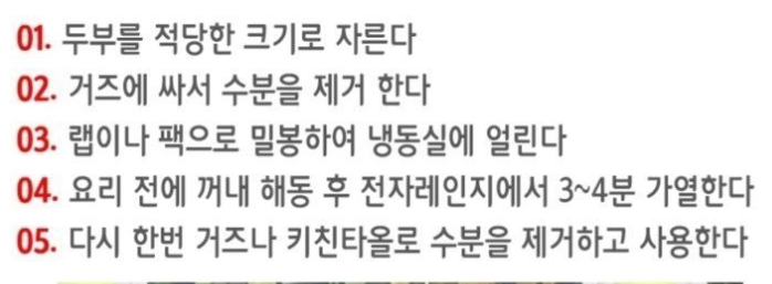 두부를 얼려서 사용하는 방법은 위에서 보시는 것처럼 간단합니다. 우리 밥상에 자주 올라오는 두부 반찬이 이렇게 좋은 줄 모르셨다면 앞으로는 열심히 드시기 바랍니다.